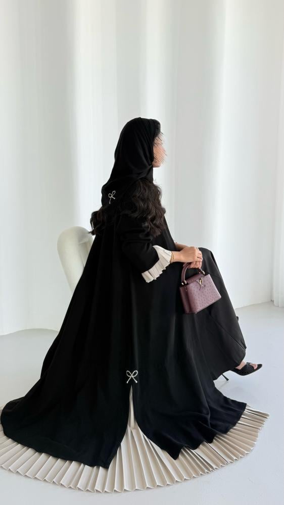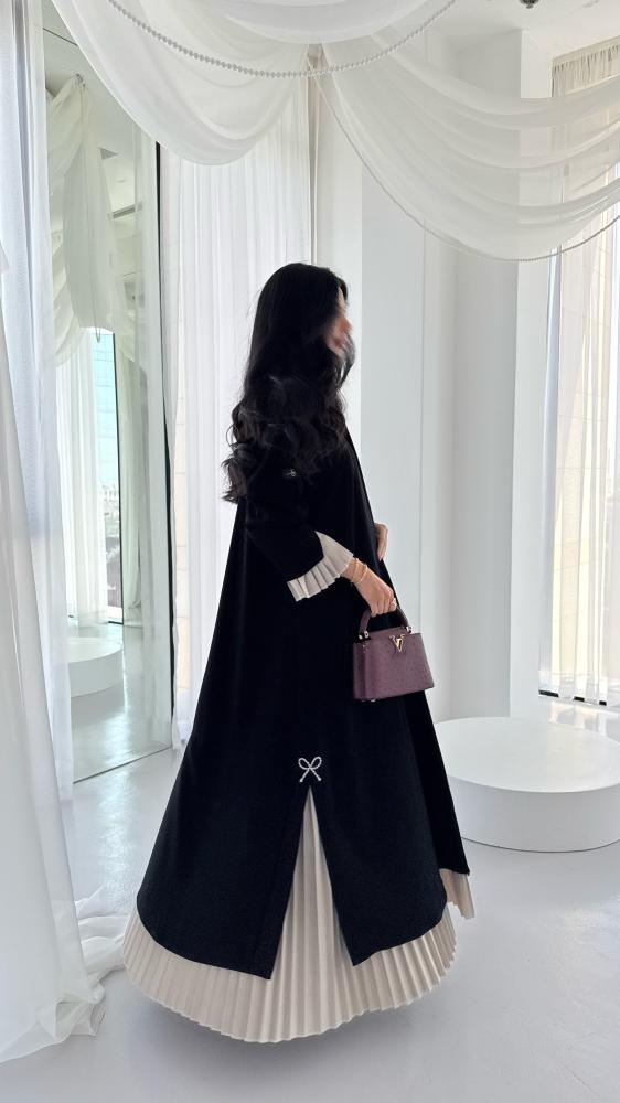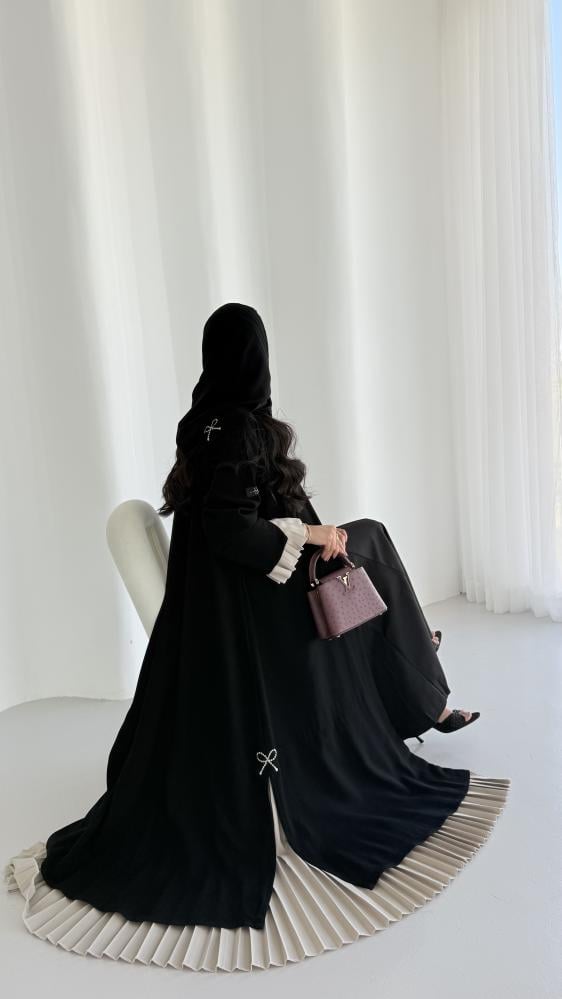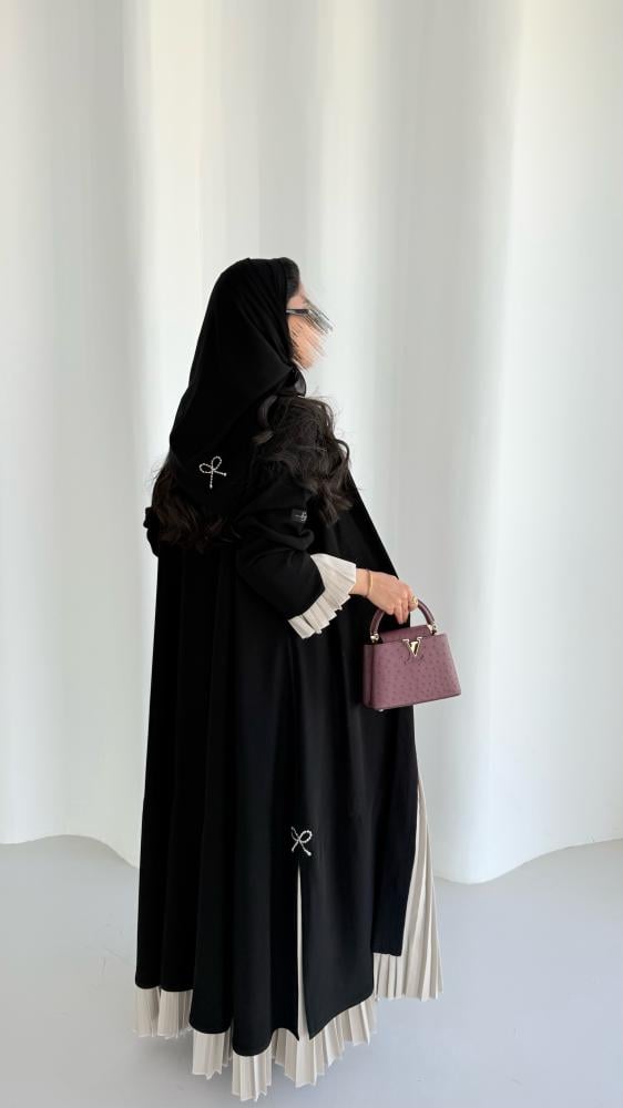 عباية من قماش الكريب الأسود مع قماش الكريب البيج المكسر، مع تطريز يدوي يزين العباية من الأسفل ويزين الطرحة من الخلف.