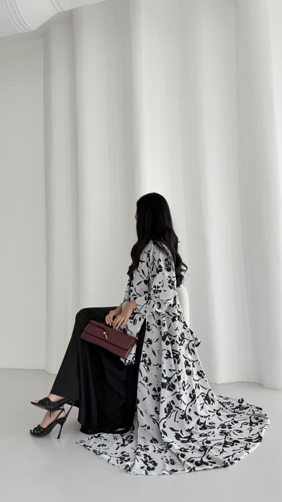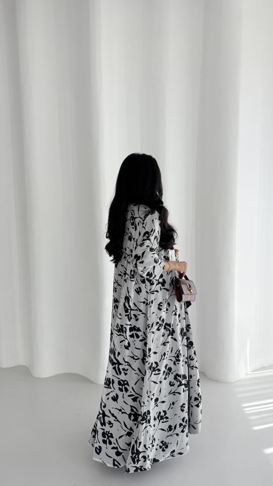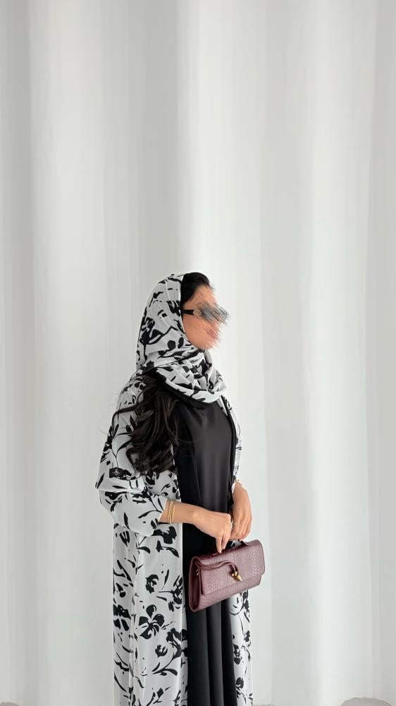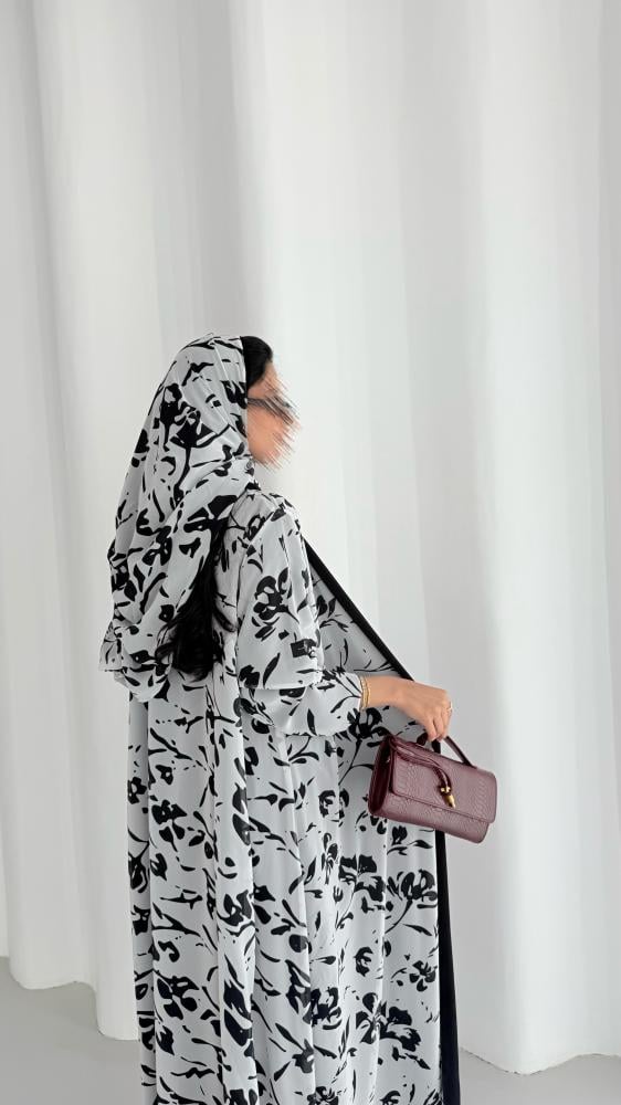 عباية دبل فيس من قماش الشيفون الأبيض المزين بطبعات الورد والمبطن بالقماش الأسود السادة