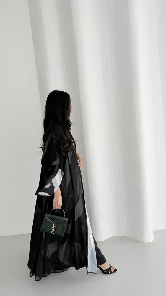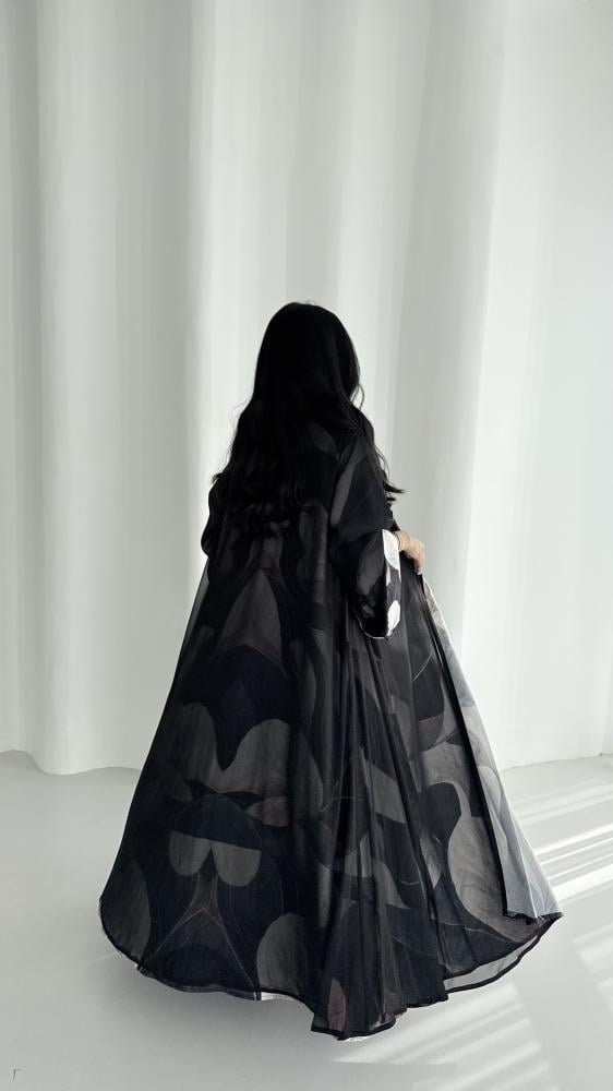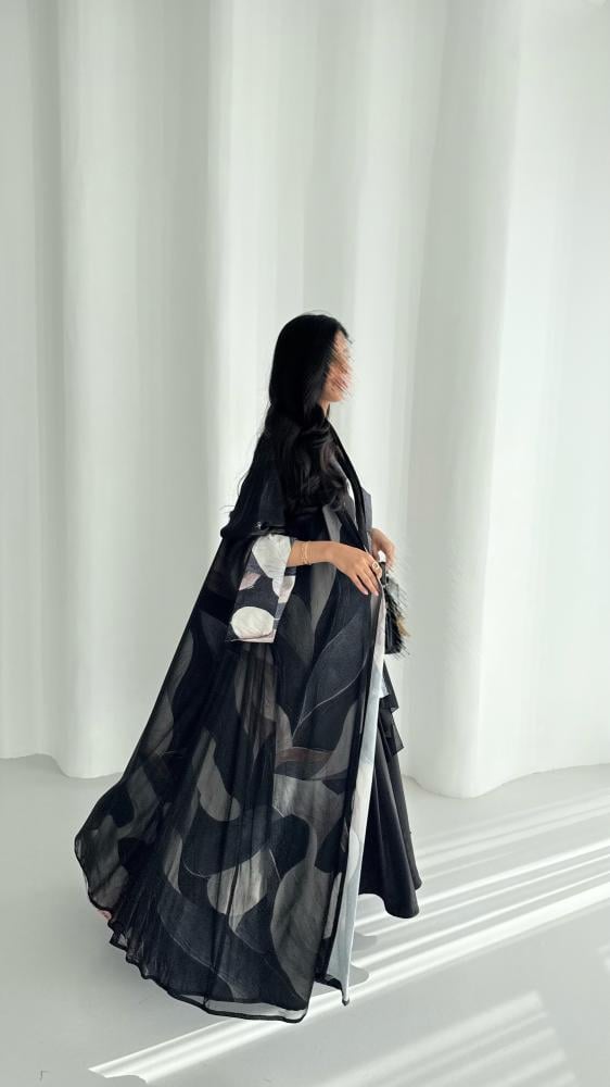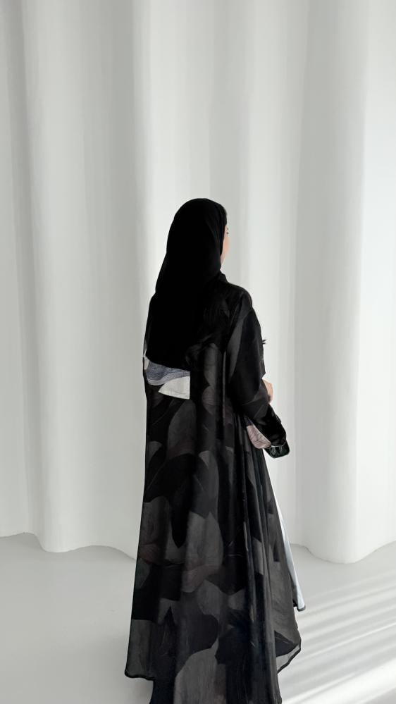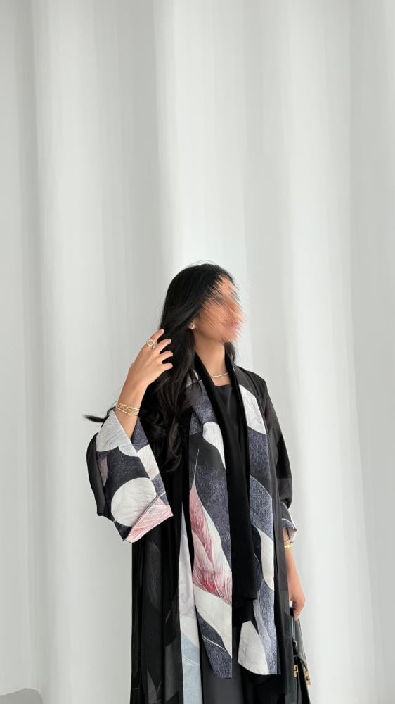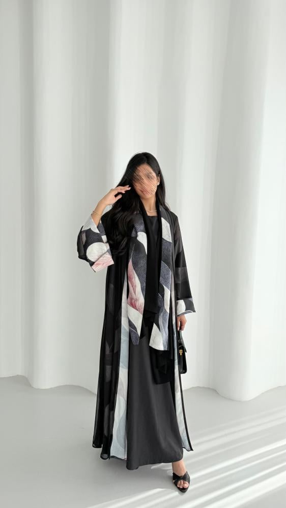 عباية من قماش الكريب المزين بطبعات ملونه مع قماش الشيفون الأسود الخفيف