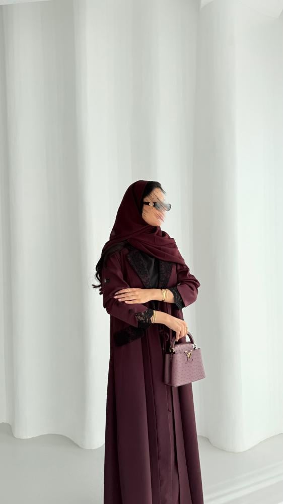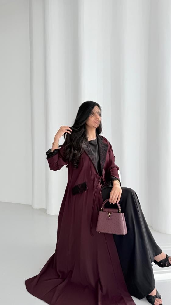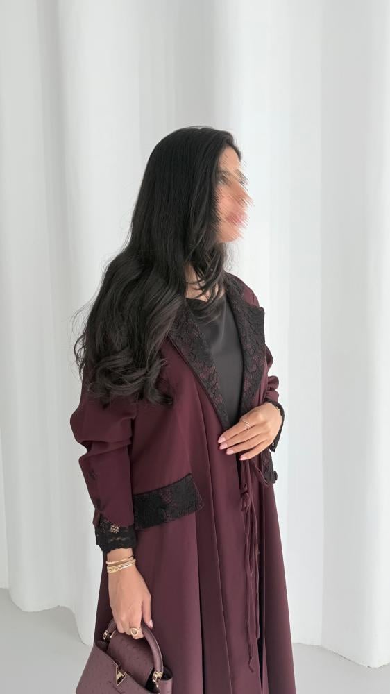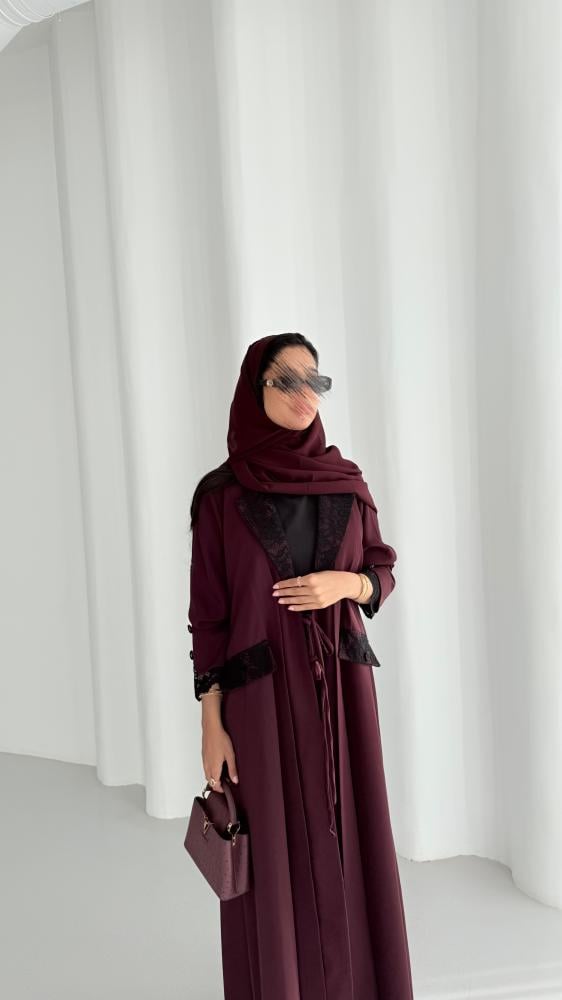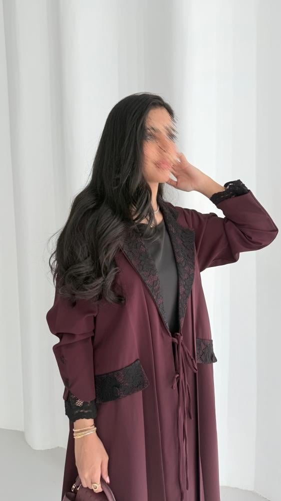 عباية بليزر من قماش الكريب الناعم باللون العنابي مع قماش الدانتيل الإيطالي