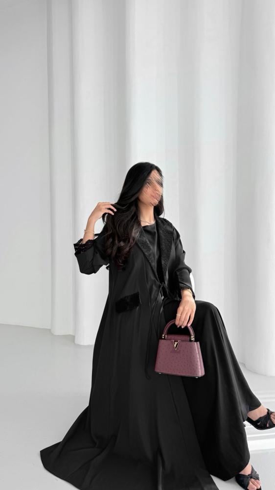 عباية بليزر من قماش الكريب الناعم باللون الأسود مع قماش الدانتيل الإيطالي