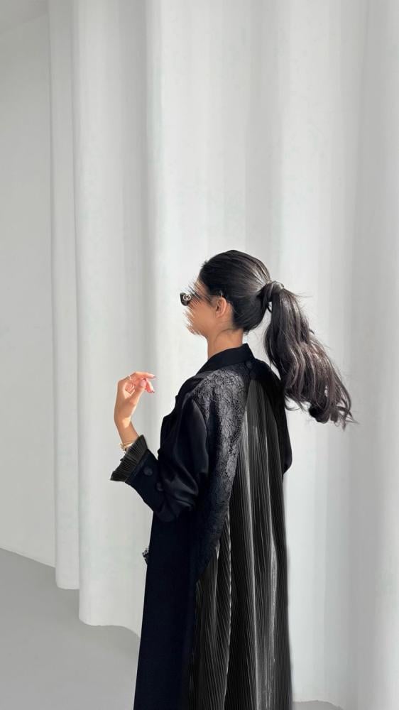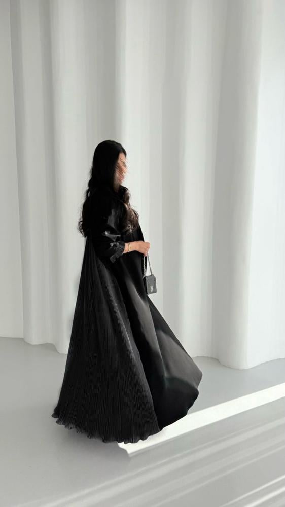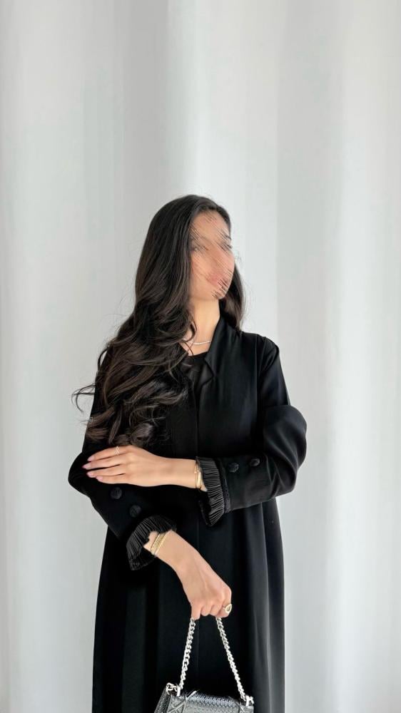 عباية من قماش الكريب الأسود مع قماش التفته الأسود المكسر مع لمسات من قماش الدانتيل الإيطالي