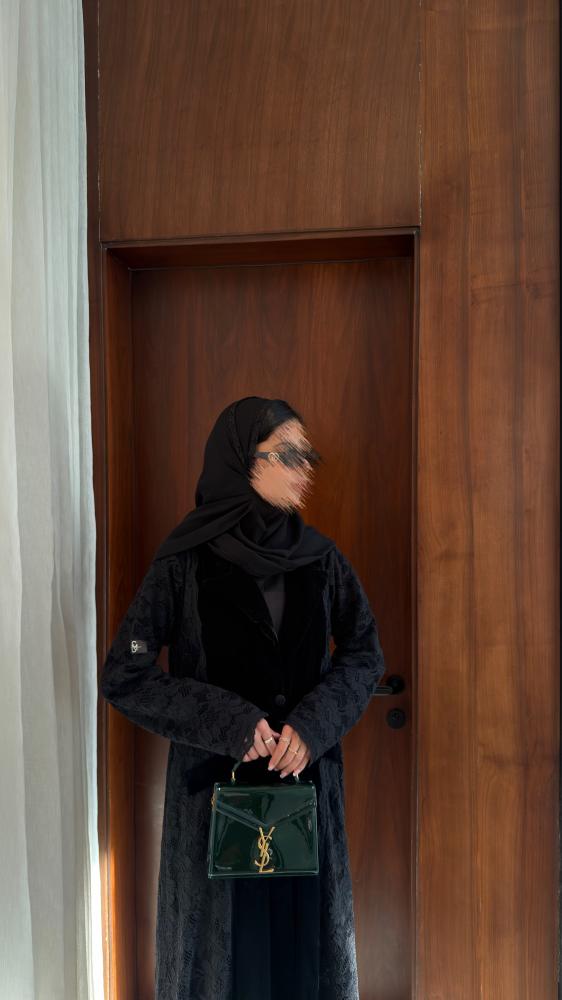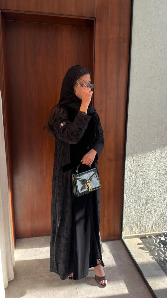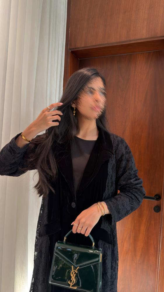 عباية من قماش المخمل الكوري الأسود مع إضافة الدانتيل الإيطالي مع الجوانب